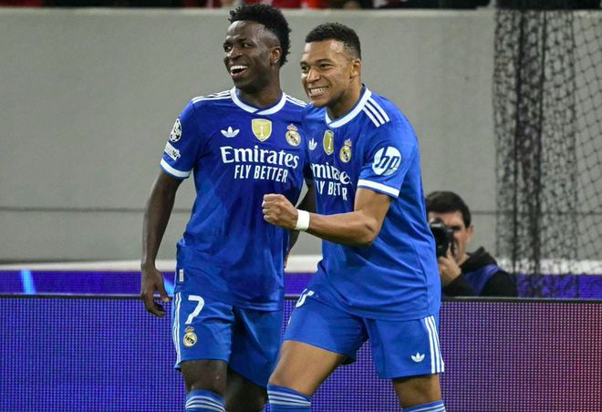 第22分钟,卡马文加将球分到左路,维尼修斯送出挑传,姆巴佩插上,单刀破门,扳平比分。