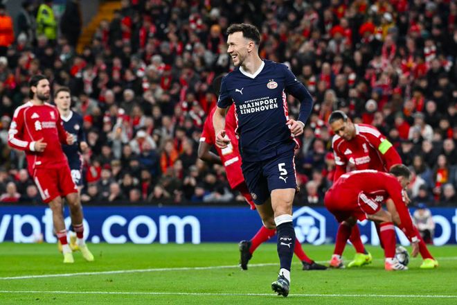 开场只有4分钟,埃因霍温获得角球,范迪克禁区内手臂高高举起,皮球打在他的手上,裁判判罚点球。范迪克疯狂向裁判解释,场边,斯洛特愣在原地,面沉似水。佩里西奇操刀主罚,稳稳命中,利物浦又一次落后了。
